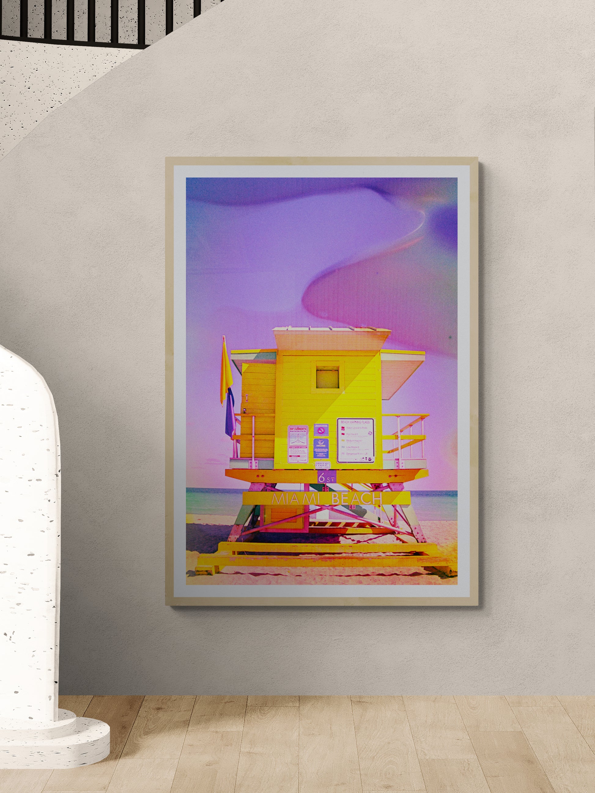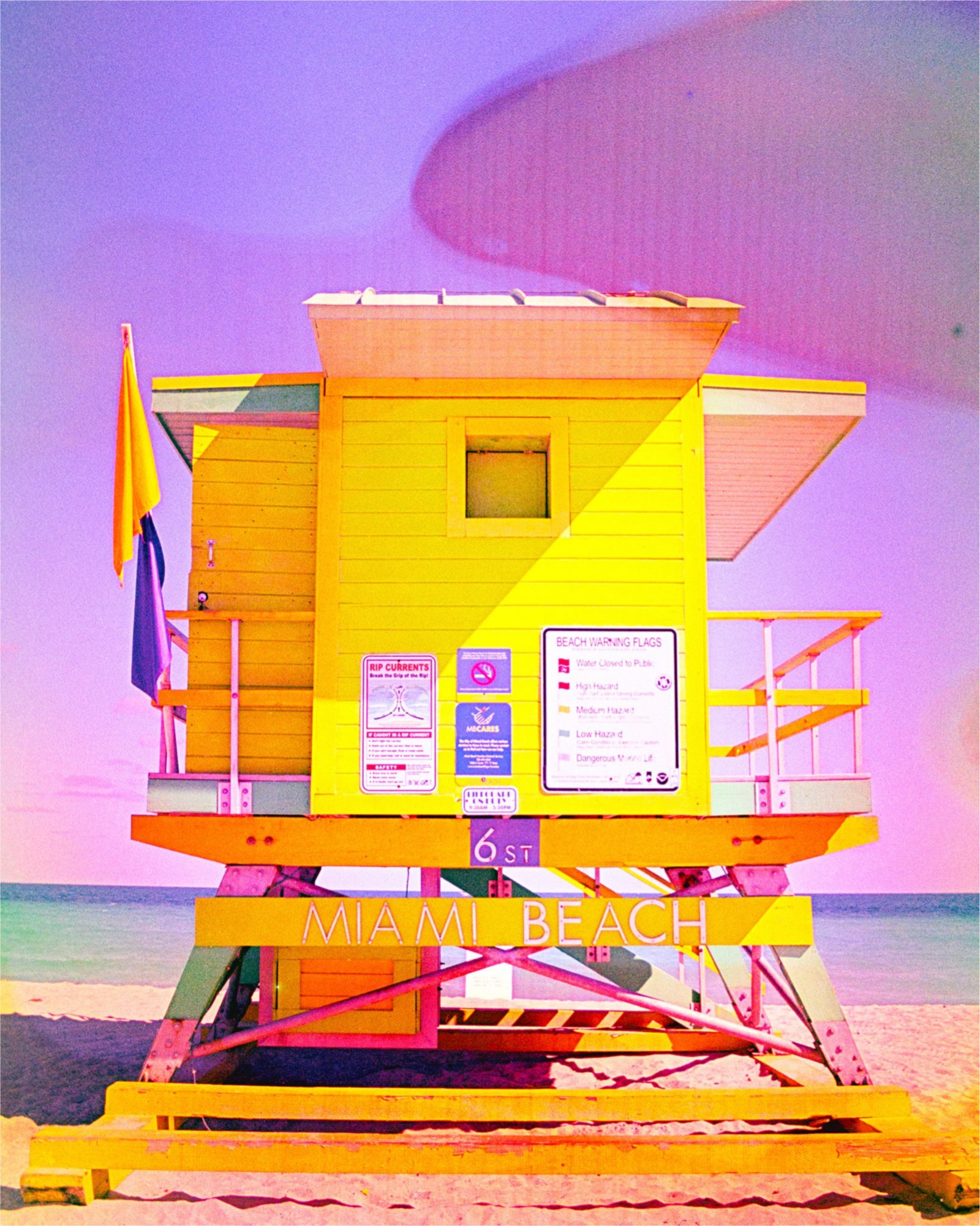 A vibrant twist on one of Miami Beach's iconic lifeguard towers. This photo of the 6th Street Tower was shot on film, then soaked in a mixture of lemon juice, salt, boiling water and dish soap.