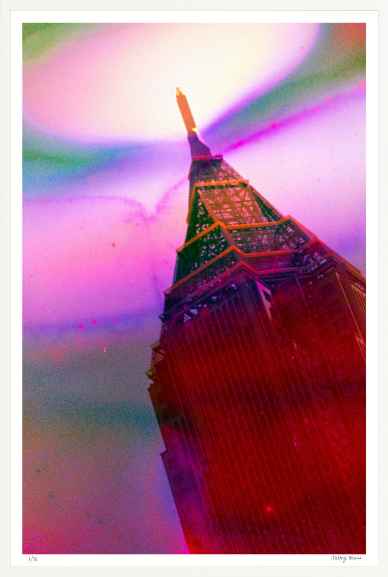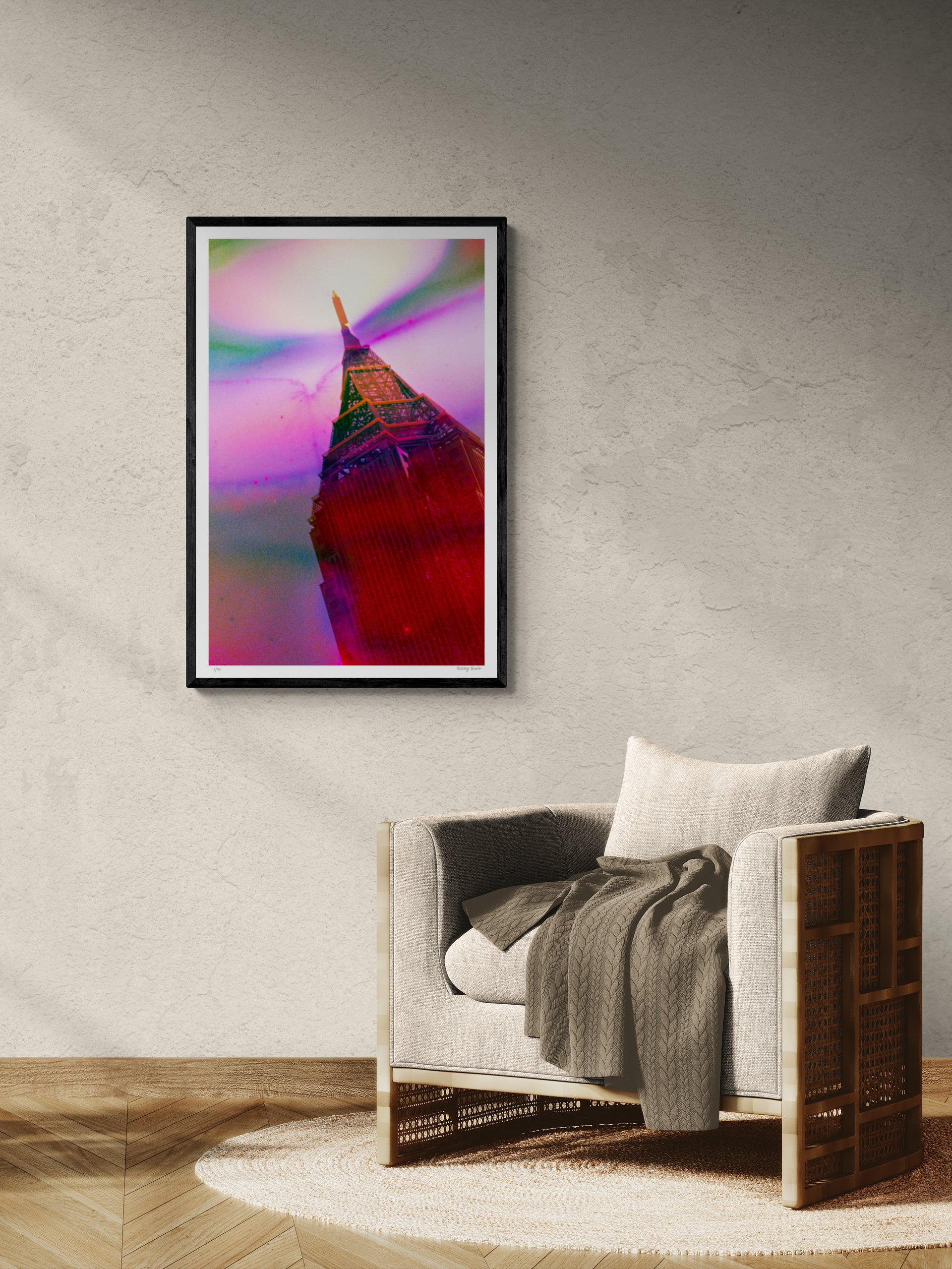 Bank of America Plaza captured in vibrant rainbow tones through experimental analog photography. Shot on film and processed using film soup—controlled chemical interventions that create bold color shifts—this piece transforms Atlanta's iconic tallest building into prismatic visual energy with luminous pinks, greens, and purples.
