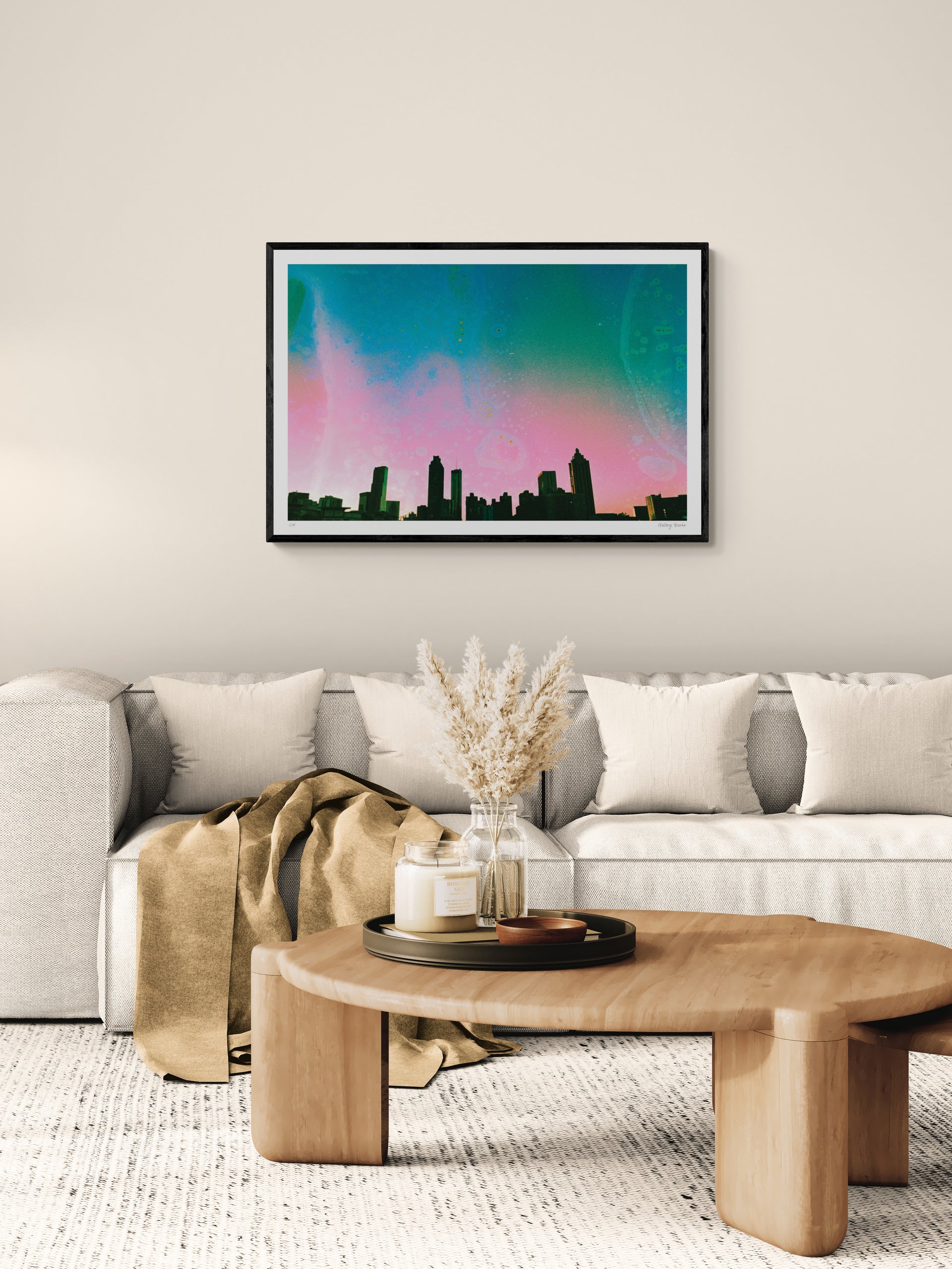 Atlanta's skyline rendered in silhouette against atmospheric pink and turquoise gradients through experimental analog photography. Shot on film and processed using film soup—controlled chemical interventions that create luminous color shifts—this piece transforms the city's architectural profile into dreamlike simplicity.