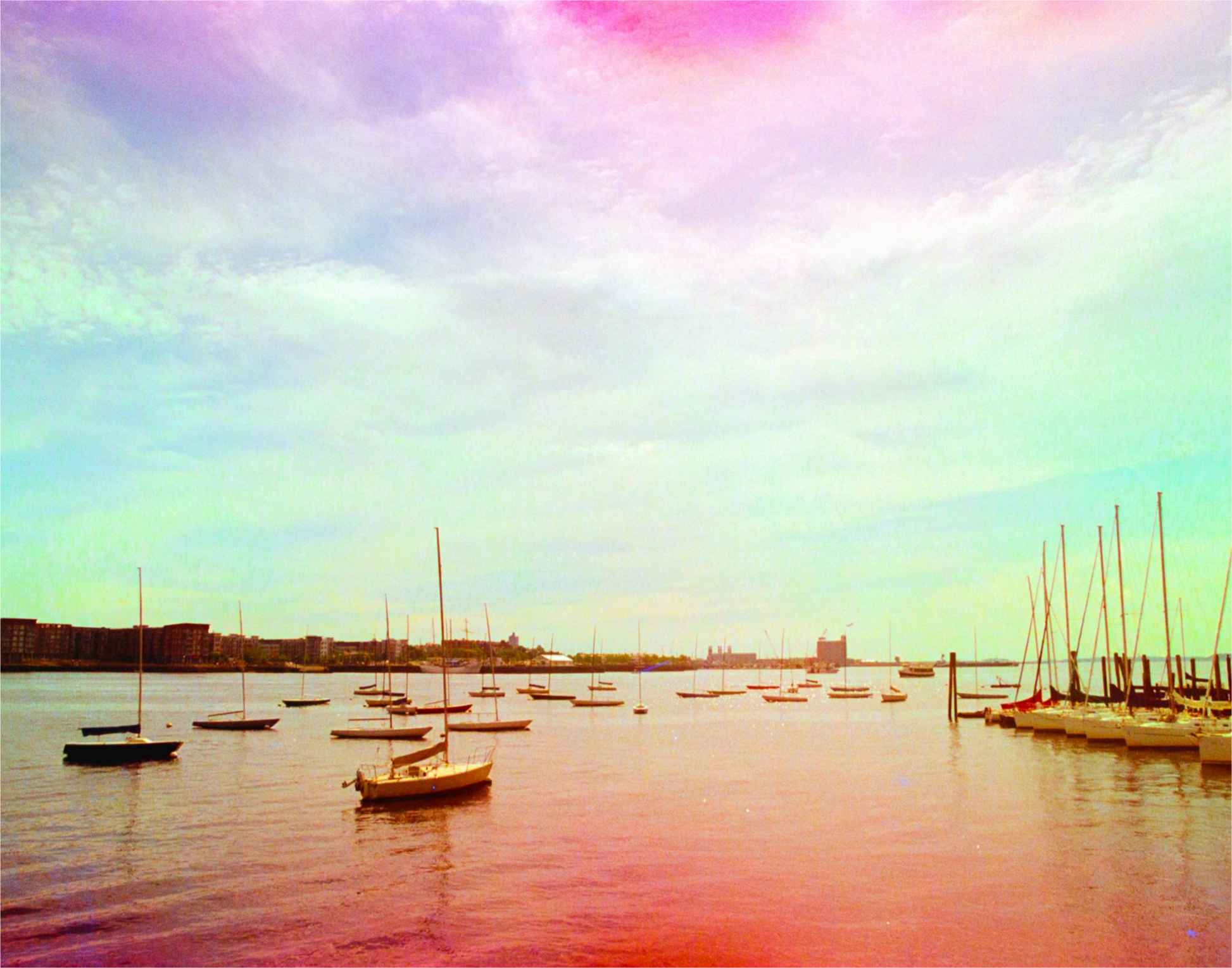 Dream of sailing away with this colorful view of boats in Boston Harbor. This vibrant yet serene image was created by soaking 35mm film in boiling water, lime juice, dish soap and salt.