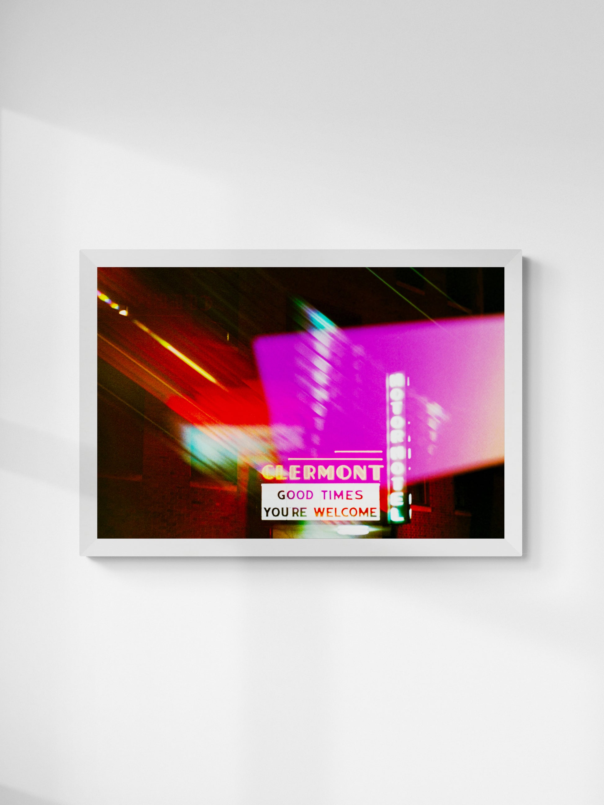 The sign says it all! This image of the iconic Hotel Clermont in Atlanta was shot on film using a multiple exposure technique, perfectly capturing its notoriety and fun.